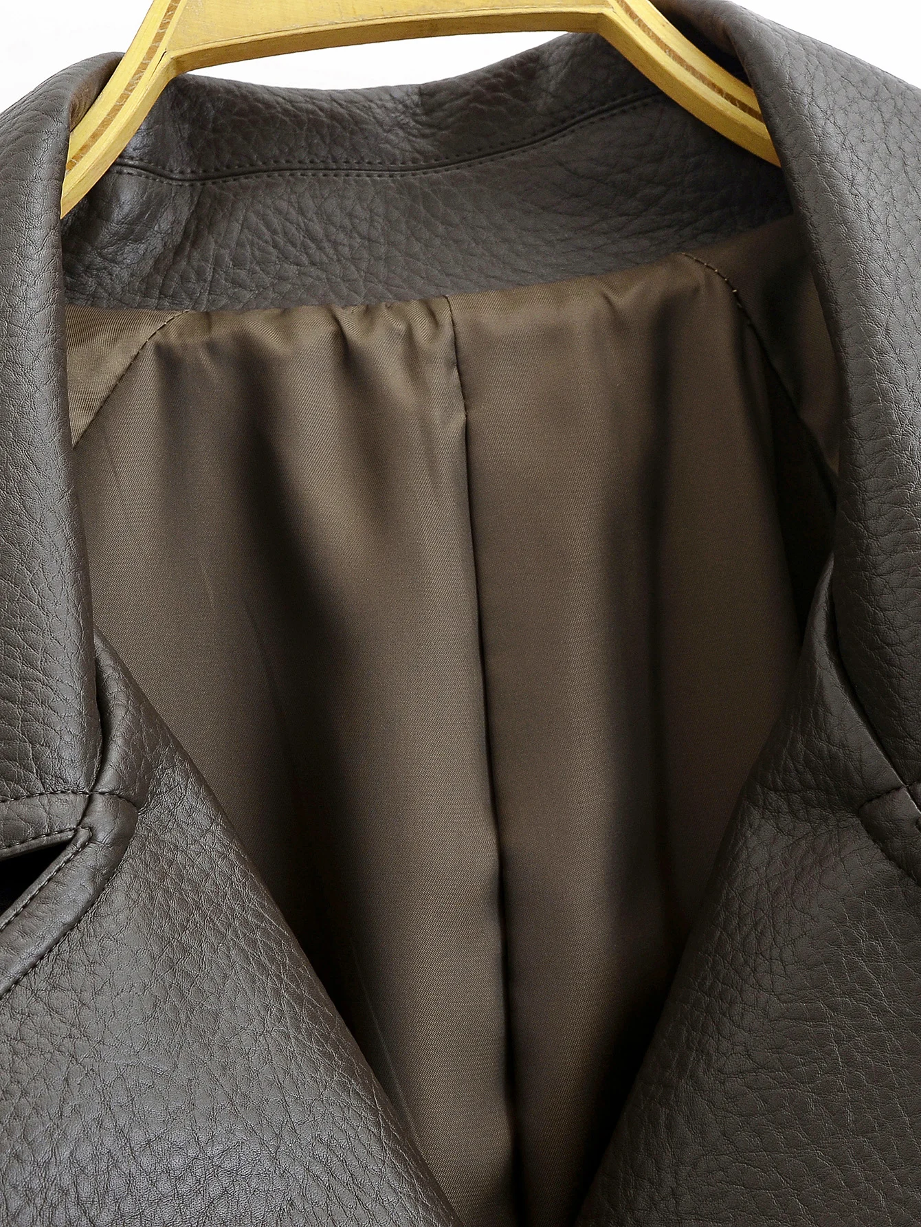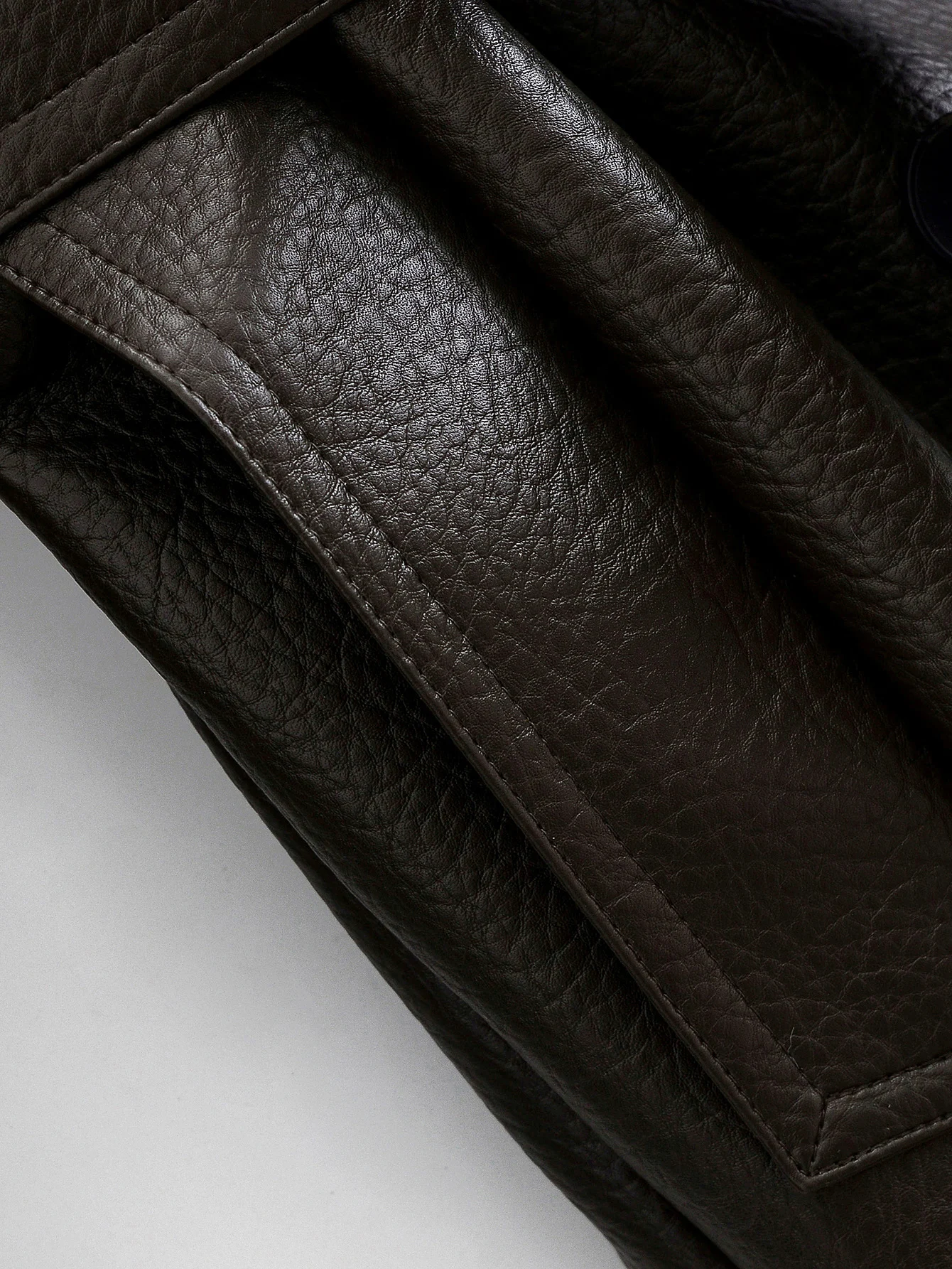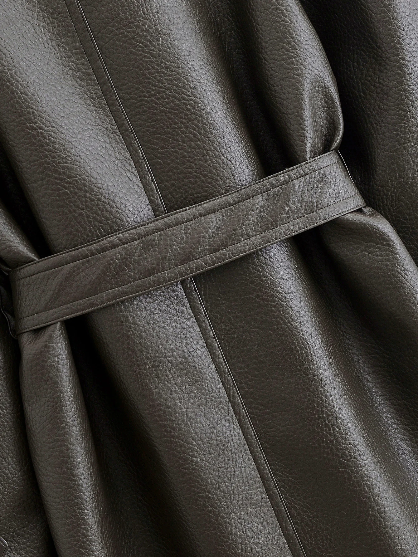 Its long, fluid silhouette is impeccably structured, evoking the refined tailoring traditions of London’s most prestigious ateliers. Made from a premium leather-effect fabric with a subtle, sophisticated sheen, this trench coat drapes effortlessly over the body, creating a commanding yet feminine presence.